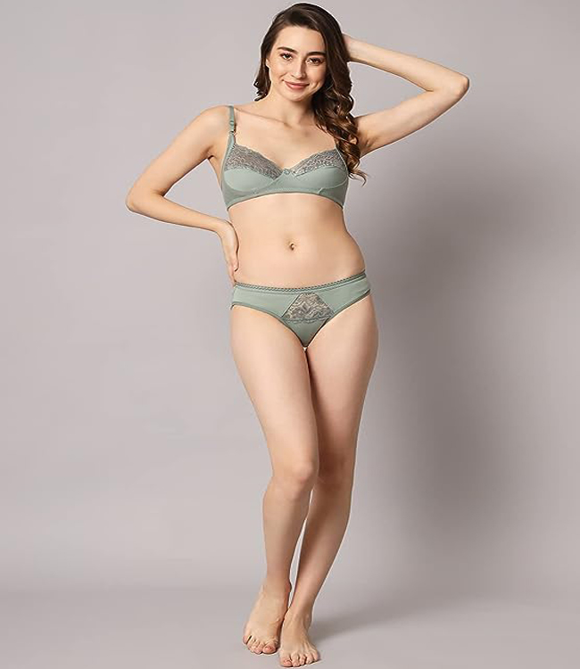 A SHAMA LACEÂ SET is a seamed bra that gives lace an excellent design in various colors. fabric and materials used in the bra are of very fine quality and are skin-friendly. the elastic strap and belt are made of nylon which gives extra comfort to the body. the bra and panty are made of lycra lace and hosiery fabric use. lace gives a nice look to this bra. The closer type is an eye hook. The bra cup size is A cup. This is a full-coverage bra.